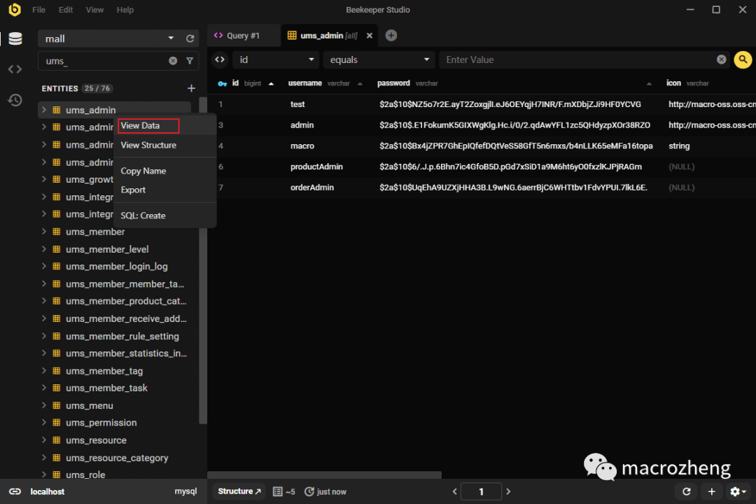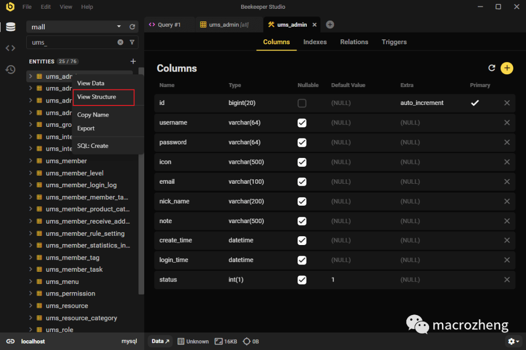 - 右键菜单还可以查看表结构,管理字段还是挺方便的;