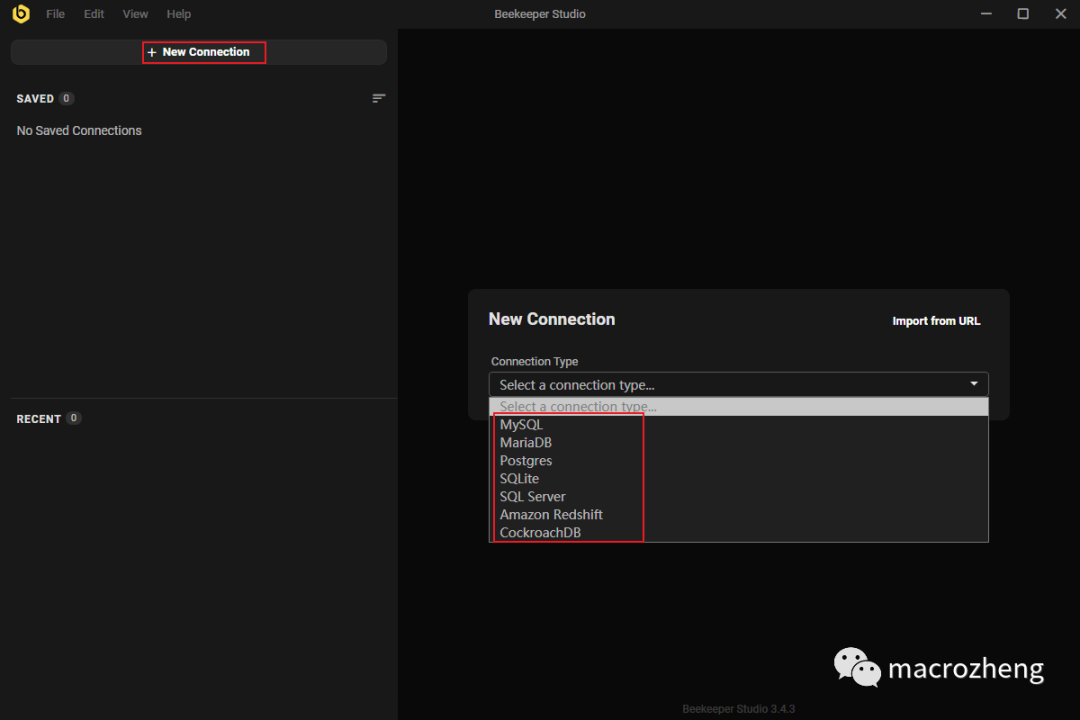 按钮来创建数据源,这里我们可以发现Beekeeper Studio仅支持常用的几种关系型数据库;
