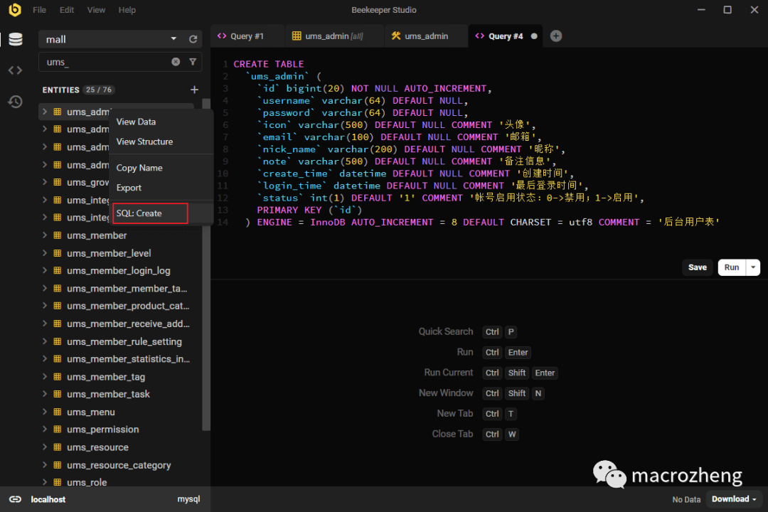 - 右键菜单还可以查看表的创建语句,这SQL主题样式,确实挺漂亮的;