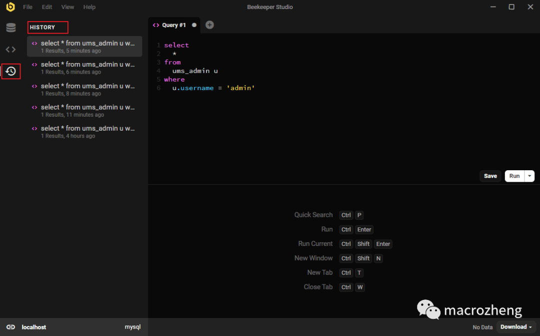 - 通过左侧按钮我们还可以查看执行SQL的历史记录。