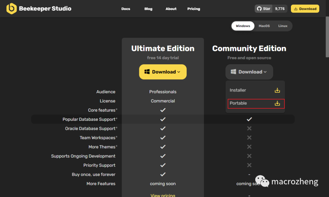 Beekeeper Studio 有免费的社区版可以使用,不想安装的小伙伴可以下载便携版,下载地址:https://www.beekeeperstudio.io/get